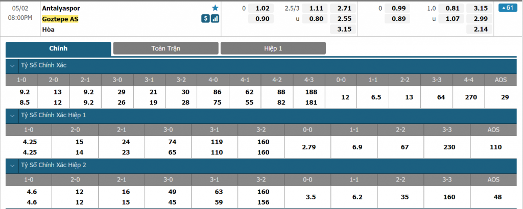 Bảng tỷ lệ kèo trực tuyến trận đấu Antalyaspor vs Goztepe: