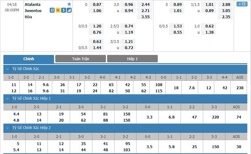 - Kèo tỉ số hiệp 1: Atalanta 1-0 Juventus