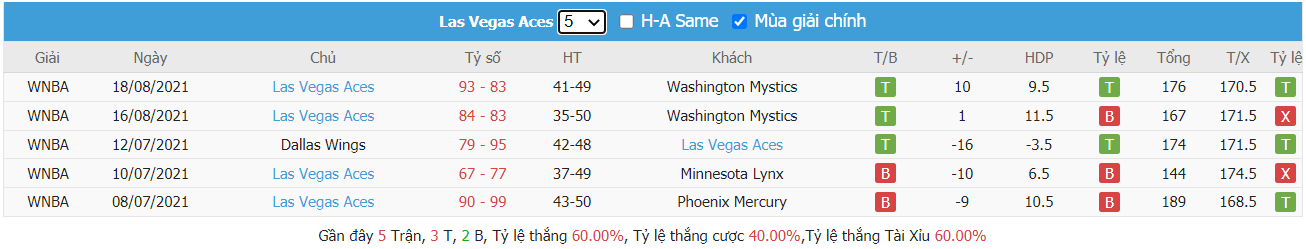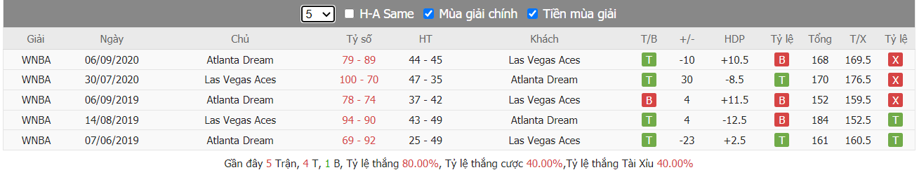 Thành tích đối đầu Atlanta Dream vs Las Vegas Aces