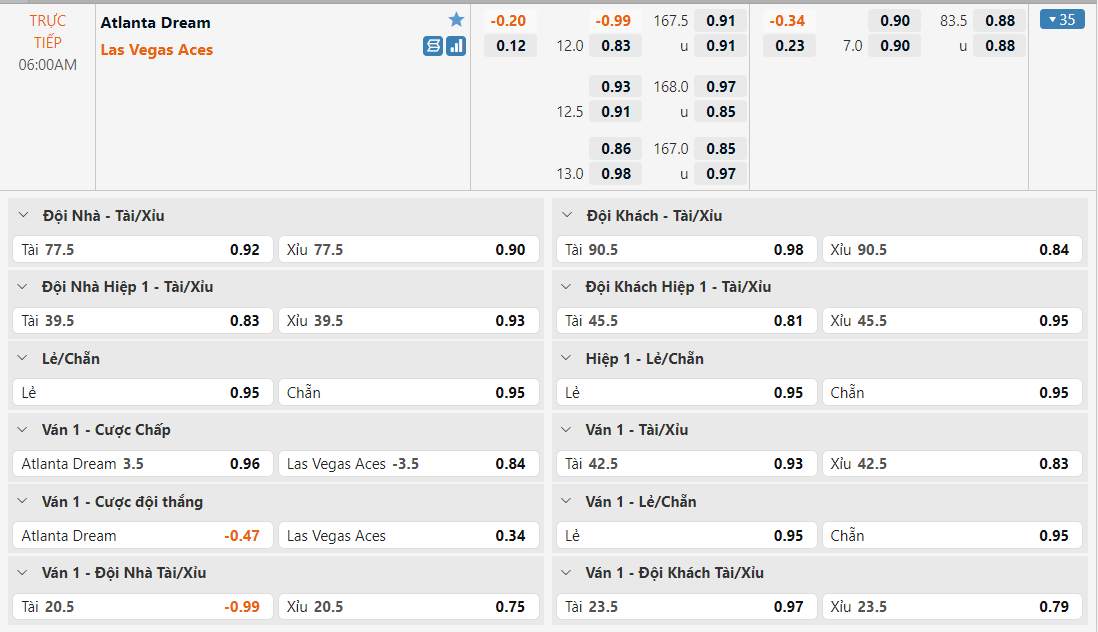 Bảng tỷ lệ kèo Atlanta Dream vs Las Vegas Aces