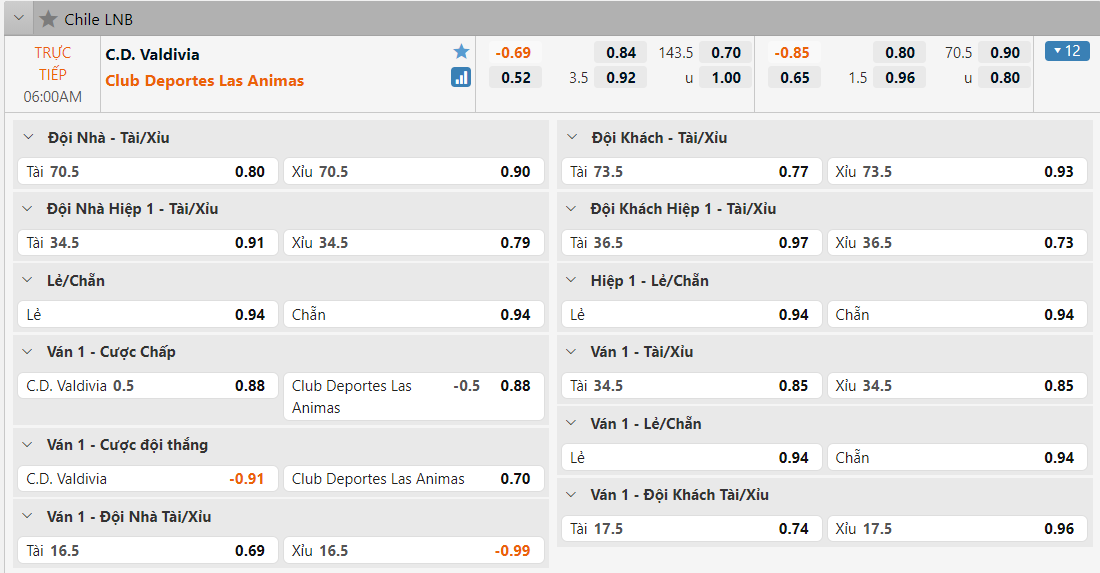 Bảng tỷ lệ kèo Deportivo Valdivia vs CD Las Ánimas
