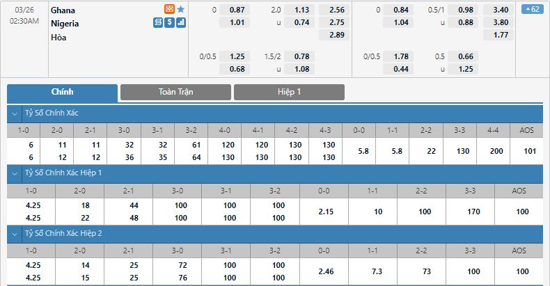 Bảng tỷ lệ kèo bóng đá Ghana vs Nigeria