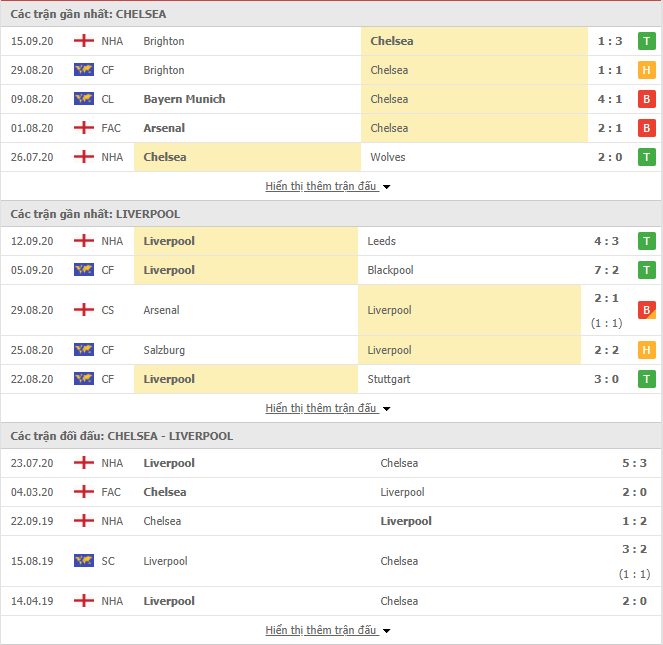 Thống kê phong độ & Lịch sử đối đầu Chelsea vs Liverpool