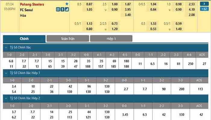 Bảng tỷ lệ kèo trực tuyến trận đấu Pohang Steelers vs FC Seoul: