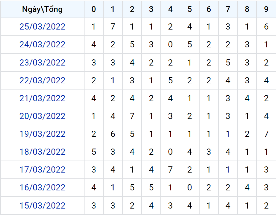 Thống kê loto XSMB theo tổng tính đến ngày 25/3/2022