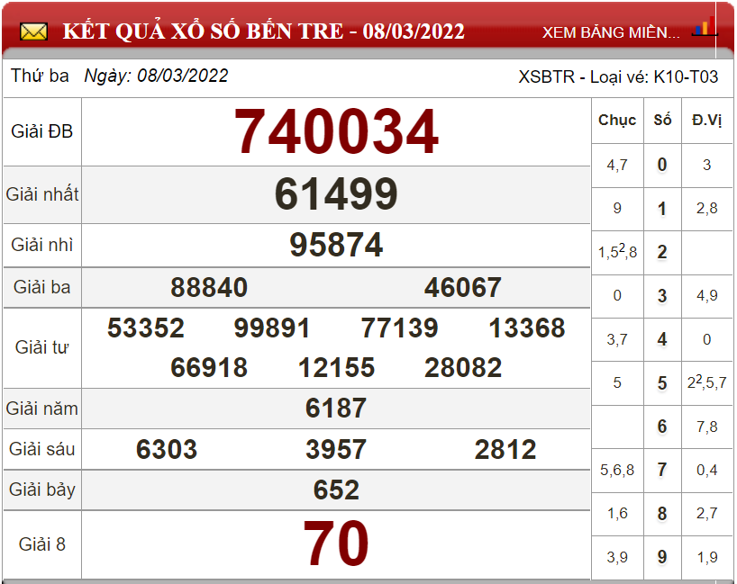 Kết quả lô đề theo xổ số Bến Tre ngày 08/03/2022