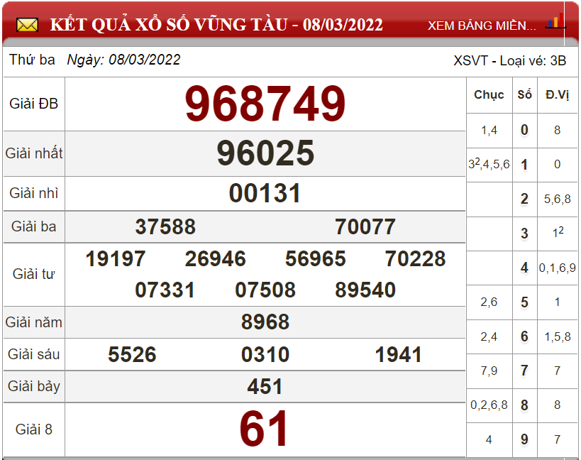 Kết quả lô đề theo xổ số Vũng Tàu ngày 08/03/2022