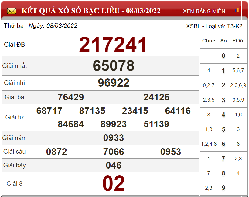 Kết quả lô đề theo xổ số Bạc Liêu ngày 08/03/2022