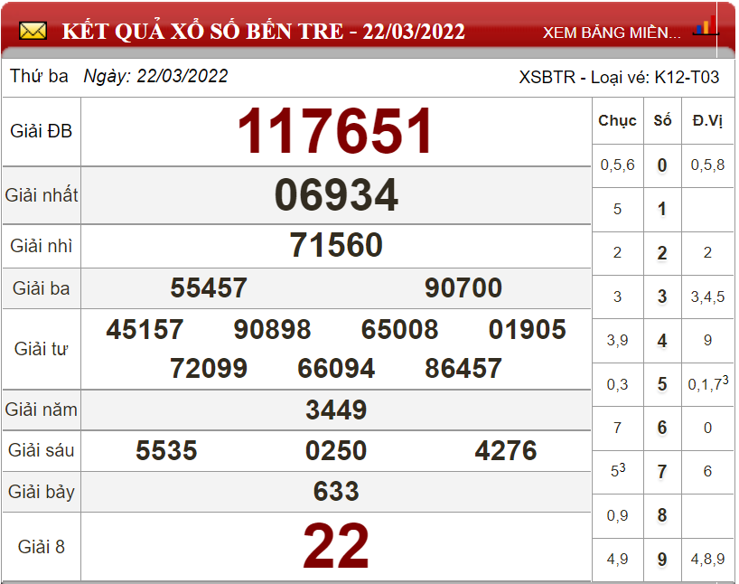 Kết quả lô đề theo xổ số Bến Tre ngày 22/3/2022