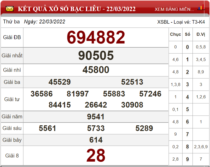 Kết quả lô đề theo xổ số Bạc Liêu ngày 22/3/2022