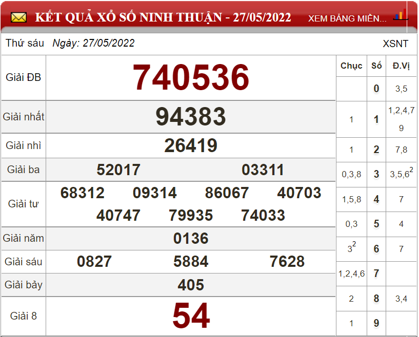 Kết quả lô đề theo xổ số Ninh Thuận ngày 27/5/2022