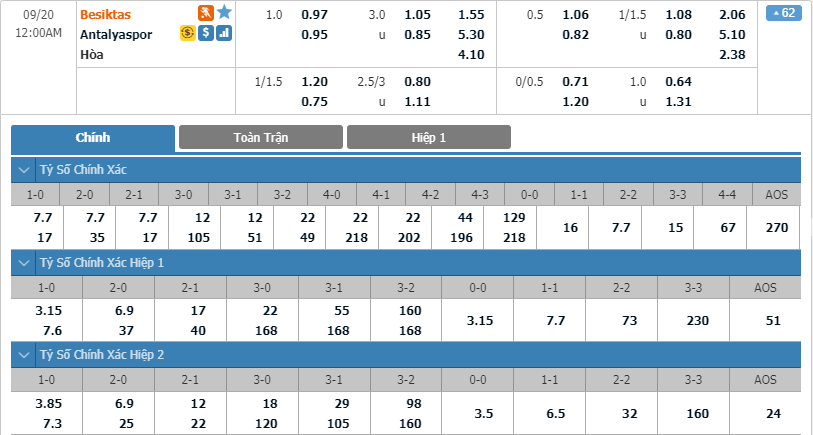- Kèo tỉ số hiệp 1: Besiktas 1-0 Antalyaspor